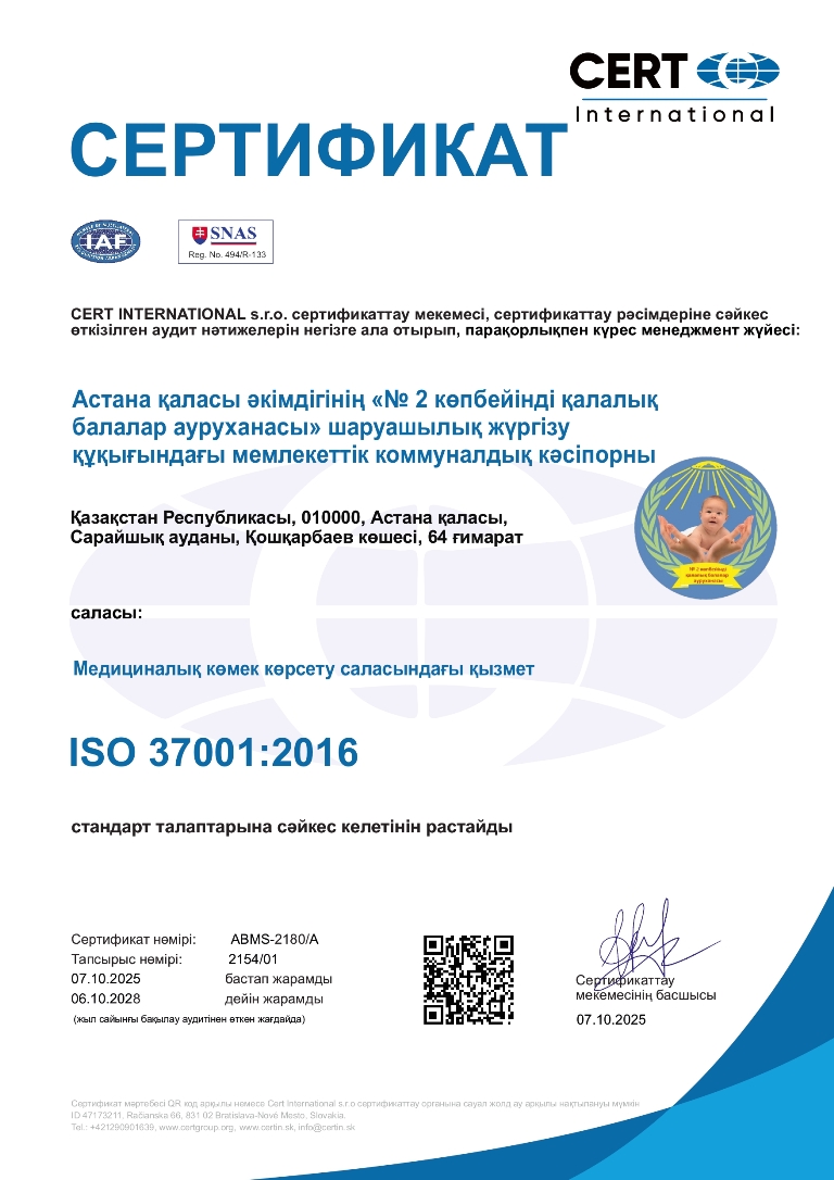 Кәсіпорын ISO 37001:2016 халықаралық стандартының және ҚР СТ ISO 37001:2017 ұлттық стандартының талаптарына сәйкес сыбайлас жемқорлыққа қарсы іс-қимыл менеджменті жүйесін сертификаттаудан сәтті өтті.