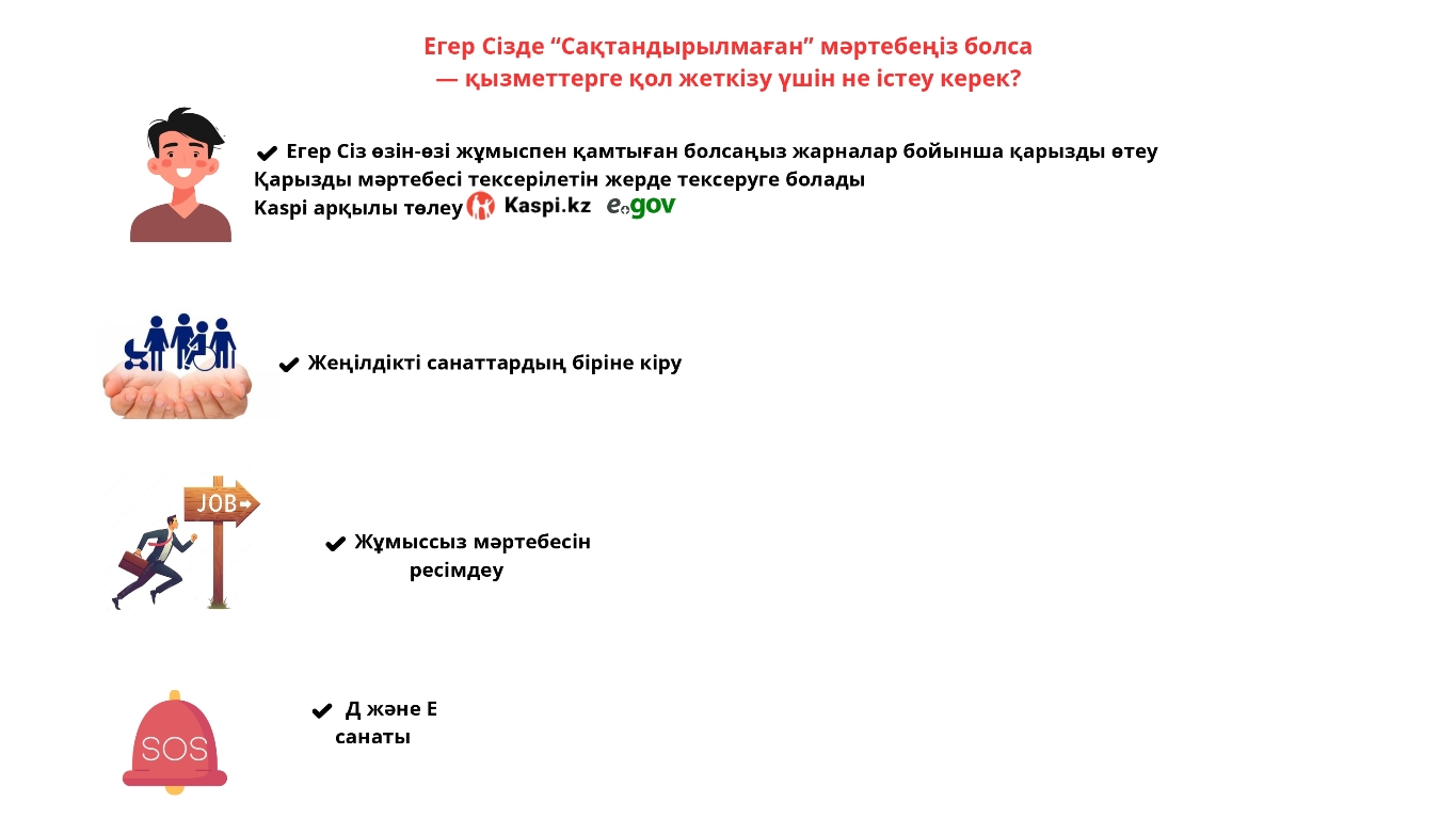 «D» (дағдарыс деңгейі) және «Е» (төтенше деңгейі) жаңа әлеуметтік санаттарына жататын адамдарға қолдау көрсетілетін болады. Бұл жеңілдігі бар адамдар емес, әлеуметтік осал деп танылған азаматтардың жаңа топтары.